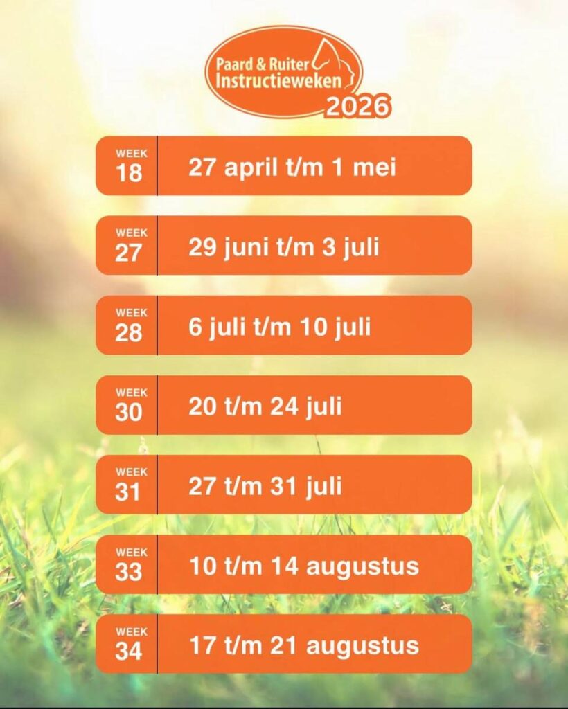 Tijdens de instructieweek volg je niet alleen rijlessen, maar leer je ook meer over je paard. Daarnaast is er natuurlijk tijd voor ontspanning en gaan we op buitenrit. Voor mensen met eigen paarden is het zelfs mogelijk deel te nemen aan een echte cross!